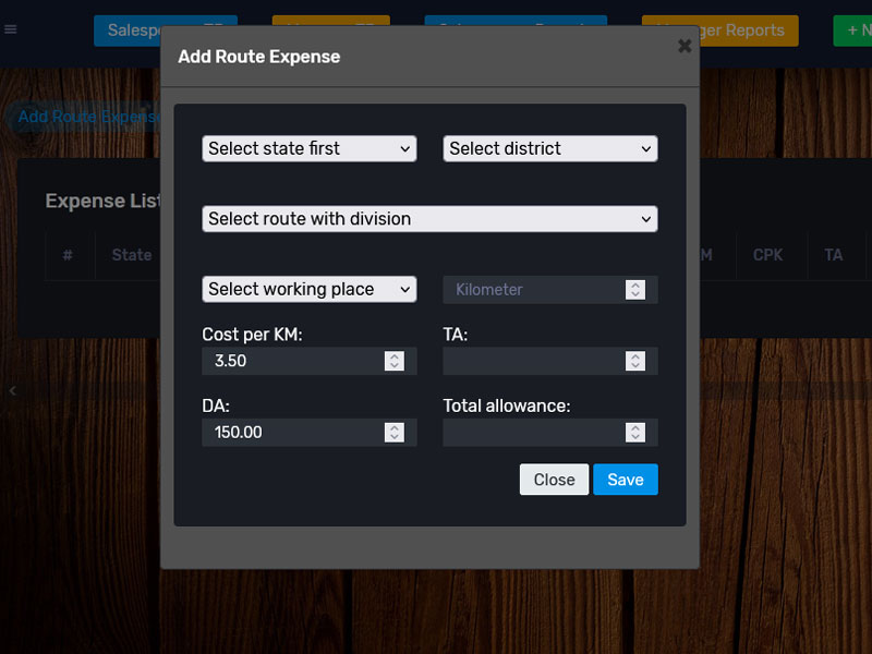 Expense reports are automatically generated based on daily report data. It includes route, KM, CPK, TA, DA, misc. expenses and total expenses.