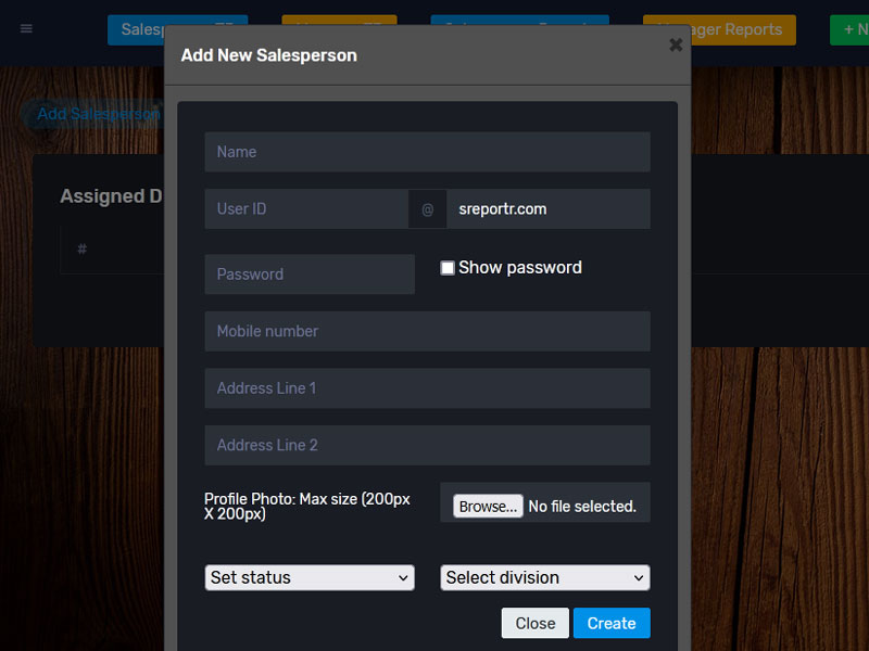 Basically there are 5 user roles available in the system which includes Salesperson, Manager, General manager, Regional Manager and Administrator. Each user has their own privileges. Top authority being administrator, who can manage salespersons and managers.