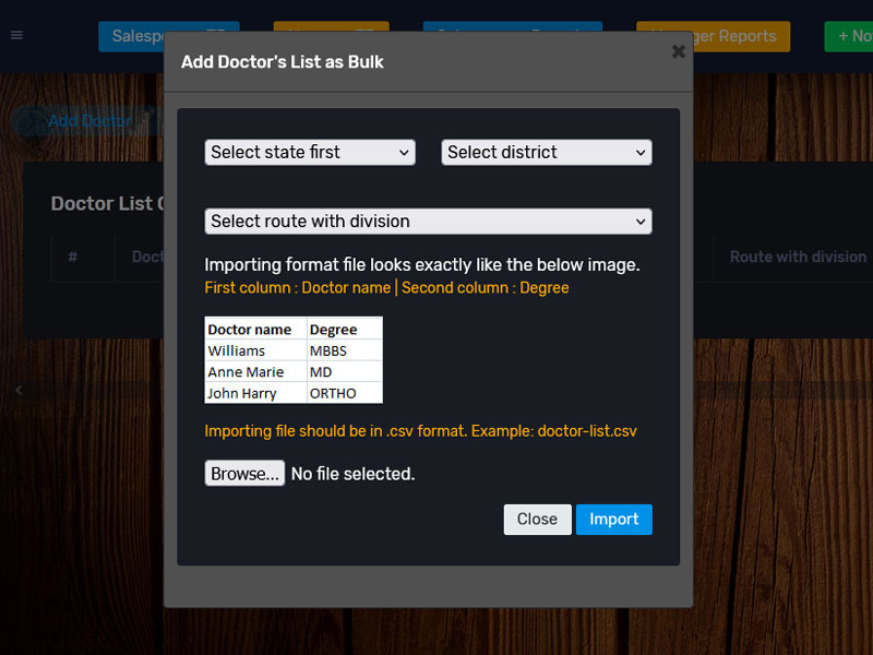 All doctors of the route can be added individually or imported as bulk file, that can maintained easliy with less effort.